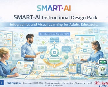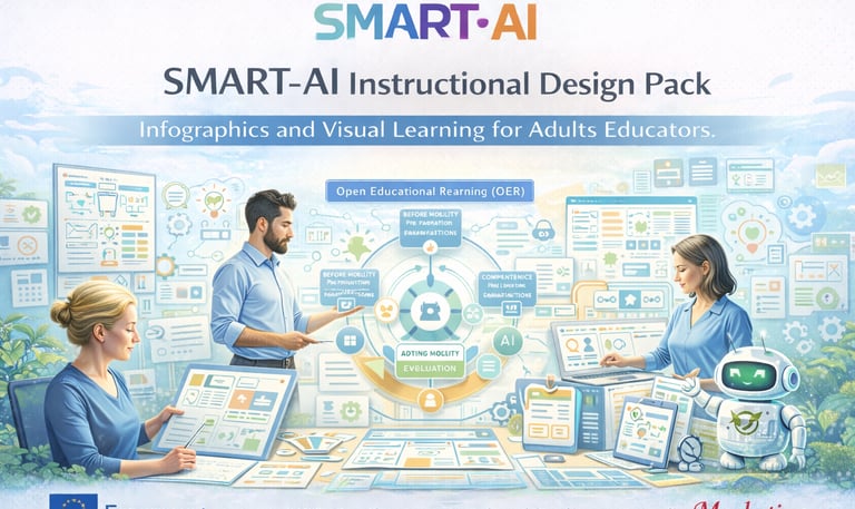 It translates learning outcomes from the SMART-AI job-shadowing mobility in Belgrade into infographics, visual learning cycles, layouts, and educator templates.