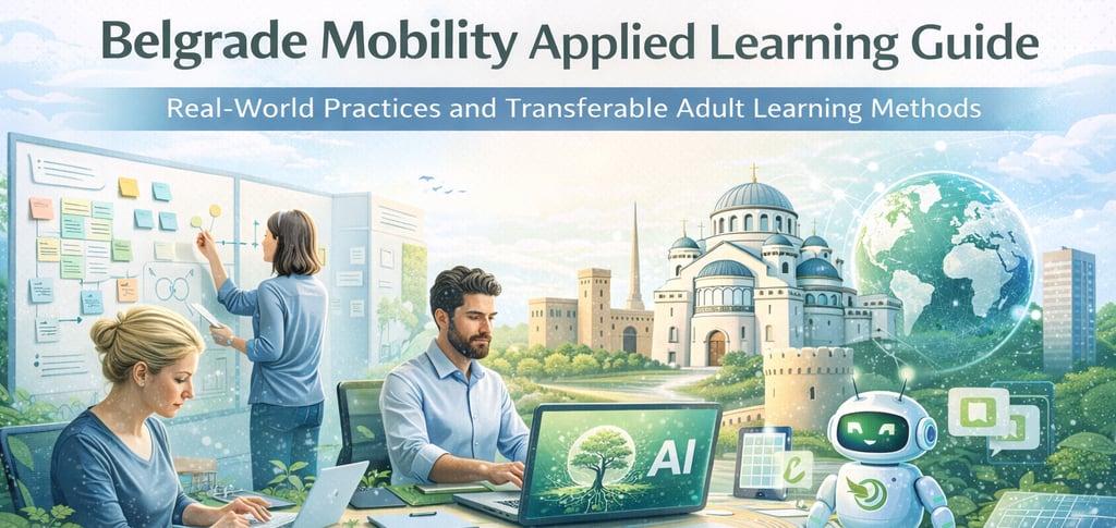 Learning becomes most meaningful when observation turns into reflection and practice. This OER documents applied learning gained during the SMART-AI job-shadowing mobility in Belgrade, focusing on real teaching environments and adult-learning practices observed at BAPUSS. It captures how adult education is delivered in practice—through structured facilitation, applied tasks, digital tools and learner-centred approaches. The guide translates mobility experiences into transferable methods that can be adapted to different adult education contexts. Special attention is given to competence-based learning, experiential activities and the practical use of digital and AI-supported tools. The resource supports adult educators and organisations in strengthening digital confidence, reflective practice and inclusive learning design. All content is presented as an open, reusable learning resource, intended to support long-term knowledge sharing beyond the mobility itself.
